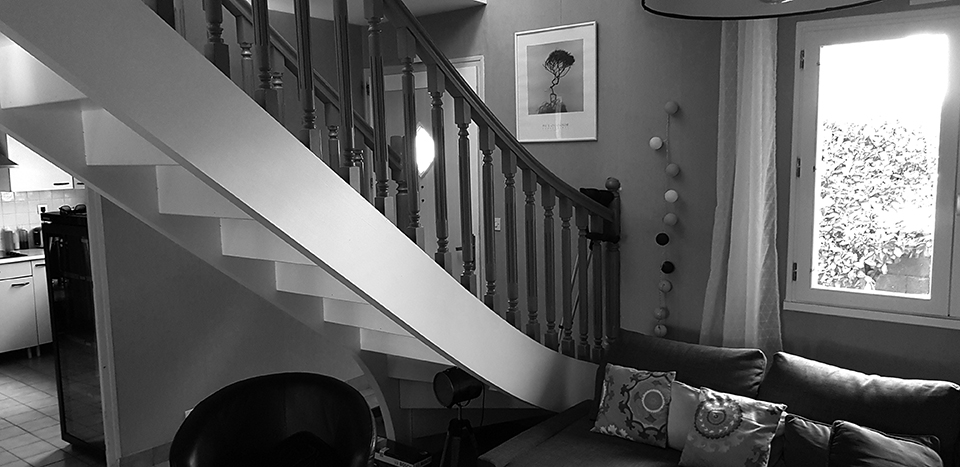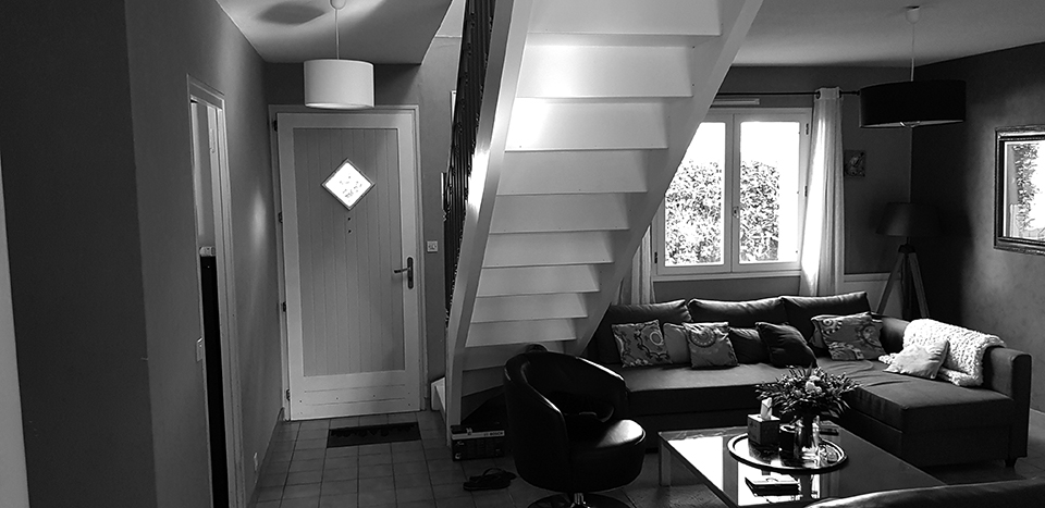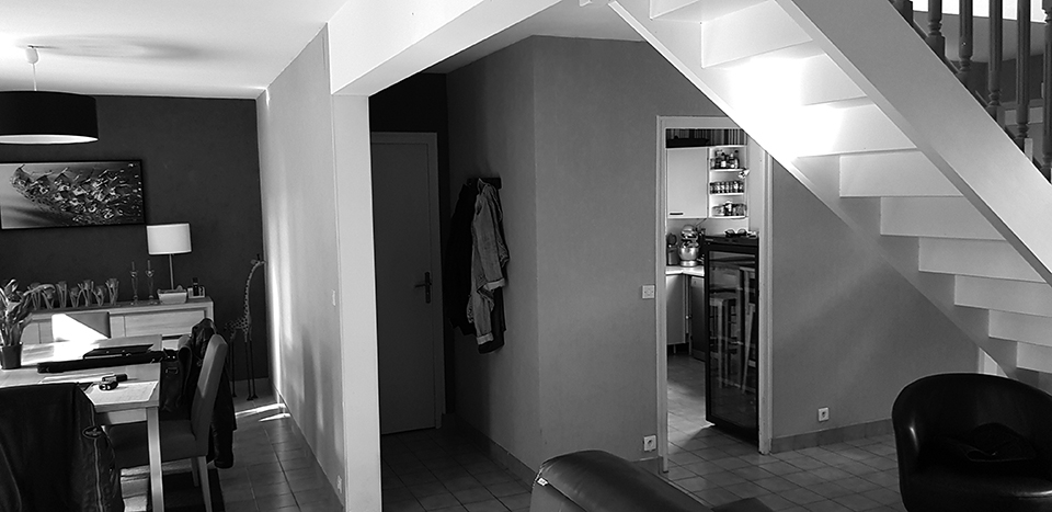 Au niveau fonctionnel, l'escalier a subi également une transformation puisqu'il accueille désormais des rangements à chaussures côté entrée et un grand coulissant "apéritif" accessible côté salon. Repeint, il arbore un nouveau style et joue de la lumière avec son garde-corps ajouré permettant de dissocier les espaces, sans pour autant cloisonner.