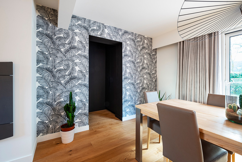 L'espace de vie est désormais ouvert sur le jardin et sublimé par la pose d'un magnifique décor mural de chez #maisonthevenon. Très élégant, il s'accorde parfaitement avec les luminaires aériens sélectionnés pour valoriser les espaces, telle la suspension Vertigo #petitefriture et les suspensions Libellule et Bamboo de chez #lamaisonforestier.