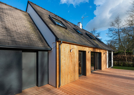 Au passage, l'extérieur s'est refait une beauté avec la pose d'un bardage en Douglas posé à claire-voie et des panneaux de bardage en Compact noir de chez #polyrey. Repeinte en noir et blanc, cette maison a désormais fière allure ! La terrasse en bois vient parfaire le confort extérieur pour profiter des rayons de soleil et de la belle exposition de la maison.